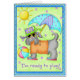 Envie uma mensagem com este cartão de saudação dizendo "Estou pronto para jogar" - você não está. Este cachorro está pronto para diversão na praia com uma bola de praia e um guarda-chuva. Com os óculos de sol legal, chinelos de fúcsia e turquesa, camiseta de praia laranja e chapéu de praia roxo, ele está pronto para ir, vestido de estilo. O fundo é verde com estrelas roxas e uma borda azul. O sol está fora e brilhando por um dia perfeito e ele está pronto para você jogar a bola. O texto na parte inferior diz "Estou Pronta para Jogar".