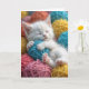 Um gatinho branco liso dorme pacificamente rodeado de bolas de fio coloridas