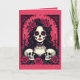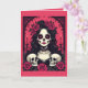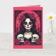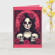 Um retrato impressionante e estilizado de uma mulher representado como uma Calavera viva: seu rosto é pintado como uma caveira branca, as órbitas dos olhos delineadas com vermelho intenso, a cavidade nasal e os dentes cuidadosamente traçados em preto. Seu cabelo escuro cai em ondas longas e brilhantes ao redor dos ombros. A paleta é dramaticamente limitada, o que aumenta o contraste entre vida e morte, beleza e decadência. Assombrosamente belo e cerimonial: uma fusão de elegância e macabro, onde o luto e a celebração se encontram. Contraste vida e morte, beleza e decadência