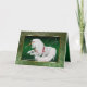 Cartão de Saudação | Bonita Alegria Fantástica de Natal Unicórnio - Esta mão pintada de unicórnio branco é enfeitada com uma poinsettia e coroa de Natal sagrada em volta do pescoço e uma corneta vermelha espiral e dourada, com mané e cauda longos e fluidos ela é uma beleza com um fundo verde brilhante cercado por ouro e filigre verde - A caligrafia Rico diz "Alegria" no topo com um lugar para escrever seu nome de texto personalizado ou ano na parte inferior, o sentimento dentro está disponível para você continuar substituindo ou deletando. Trabalho de arte criado e assinado por ©WhimsicalArtwork™. Isto é parte de uma mistura e combinação de Coleção de Natal Magical Unicorn.