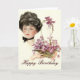 Ilustração vítrea de uma beleza cabeleira escura com cabelo arrepiado, uma fita escura ao redor do pescoço e segurando uma cesta de flores roxas. Abaixo, no roteiro, "Parabéns". Personalize o dentro como desejar.