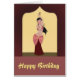 Um cartão de aniversário fofo ilustrado por um dançarino de barriga em cores marrom e amarela. Esta adorável garota veste uma fantasia tradicional de dança de barriga árabe. Tema das Noites Árabes. A saudação de aniversário pode ser personalizada para qualquer tipo de saudação.
