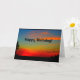 Um pôr do sol laranja e azul, com uma nuvem a céu aberto, é o tema do meu cartão de aniversário "Feliz Aniversário - Espero que seja Bonito do Sol ao Sol". Fotografei esta cena ao longo da linha costeira do lindo lago Winnebago em Quinney, Wisconsin.