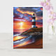 Um belo pôr do sol, ondas oceânicas e um cartão de aniversário feliz de um farol vermelho e branco.