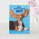 Bonita Caça-Basset com as orelhas levantadas no ar e dizendo (Seu Nome), ouvi que você está (adicione idade)?! Dentro: Uau! Em anos de cão você seria morto! Ainda bem que não és um cão. Feliz aniversário! Cartão engraçado para amantes de cães (especialmente amantes de Basset Hound).