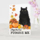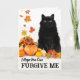 Um grande gato preto fluffy está sentado ao lado de uma pilha de folhas de outono e várias gourdes e abóboras no cobrir deste cartão tardio do Dia das Bruxas. Espero que você possa me dar uma mensagem no cobrir. Personalize o cobrir e o texto do dentro como quiser. Arte, imagem e direitos de autor versos © Shoaff Ballanger Studios, 2023.