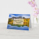 Cartão de aniversário com uma bela fotografia do país. Montanhas pedras com uma floresta de outono em cores brilhantes. Um lago tranquilo reflete as montanhas, árvores e gramíneas.