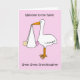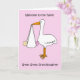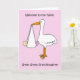 Um desenho de uma cegonha gigante segurando uma menina em um lençol que pendura de bico. As palavras "Bem-vindo à neta do Excelente da família" acompanham a imagem.
