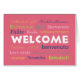Um design de boas-vindas colorido onde a palavra bem-vinda é feita em línguas como inglês, holandês, espanhol, japonês e muito mais! Em cores como verde, verde, laranja, azul e amarelo contra fundo rosa! O texto dentro deste cartão de saudação pode ser alterado e personalizado!