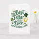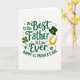 This greeting card features a digital illustration on a bright white background, with the main message “To the Best Father in Law Ever” centered in deep emerald green lettering that feels like a warm, familiar hug 💚. Just below, “Happy St. Patrick’s Day” curves along the lower area in the same green, set in a simple, friendly style that balances the larger headline. Small three-leaf shamrocks in rich green are scattered around the words like little nods of affection, adding gentle movement without crowding the space ☘️. In the upper right corner, a dark green leprechaun hat sits at a jaunty angle, and its golden buckle catches the eye like a small flash of celebration. Beneath the hat, a golden horseshoe rests as a lucky accent, echoing the warm tone of the buckle. Tiny gold sparkles dot the area around the text, like confetti frozen midair. The hat, horseshoe, and sparkles cluster toward the right side while the shamrocks lightly pepper the open white space around the centered green lettering.