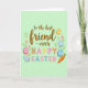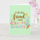 This greeting card features a soft mint green background with a friendly two-part message centered on the front. Near the top center, “to the best friend ever” appears in smooth brown cursive lettering, giving the words a gentle, affectionate tone. Just below it, “HAPPY EASTER” is set in rounded, multicolored letters—pinks, oranges, yellows, and blues—with a thin outline that helps each letter stand out. Around the text, four decorated eggs in speckled pink, sunny yellow, and light blue sit like little gifts, each dotted with small white spots for added texture 🐰. Tender green leafy sprigs and small, simple flowers curl around the message, creating a loose wreath shape that feels like a friendly hug between close companions 🌷. In the lower right corner, an orange carrot with leafy green tops adds a bright accent and balances the layout. The flowers are scattered in soft tones near the edges, with the eggs spaced evenly around the center to frame the words.