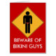 A silhueta de um homem em um biquini vermelho em um sinal diamante-dado forma amarelo e o texto Beware de caras do biquini.