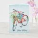 Bicicleta vermelha com buquê de flor em uma cesta de fundo de turquesa texturizado macio. Todo o texto pode ser alterado.