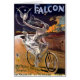 Um poster vintage de Jean de Paleologue para Franco American Bicycle Co. por volta de 1893. Uma mulher vestida de fofoca andando de bicicleta. Um falcão branco senta-se na mão dela.
