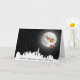 Estrelas no céu negro com Papais noeis no trenó com renas, presentes e uma lua de cheio brilhando voando sobre uma linha branca de horizonte de uma cidade grande. O texto pode ser alterado ou excluído.