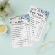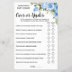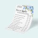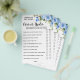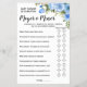 Flores azuis sobre ou sob o jogo do Chá de fraldas. Jogos das versões inglesa e espanhola incluídos (frente e verso). Mude Bride para Name (Nome) no modelo para as versões em inglês e espanhol. Para mais personalização (pergunta de alteração e outra redação, cor da fonte, estilo da fonte ), clique em personalizar, role para baixo e clique no link "clique para personalizar mais". COMO JOGAR: Os convidados adivinham se acham que o número em cada declaração está acabado ou abaixo