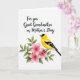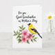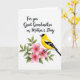 Designed with a soft watercolor look, the artwork features a small bird nestled near a cluster of spring flowers, creating a gentle, affectionate mood ❤️. The bird is golden yellow with a dark cap and dark wing markings, posed as if pausing calmly beside someone it trusts. Below and to the left, several pale pink blossoms open toward the bird, their deeper pink centers adding a sweet, close-up intimacy like a quiet exchange between friends. Fresh green leaves surround the flowers with light-to-deeper shading and a few yellow-tinged edges that suggest new growth 🌼. The background stays bright white, keeping the scene airy and letting the colors stand out without distraction. Across the upper area, a flowing line of text reads “For you Great Grandmother on Mother’s Day,” set in a dark tone that contrasts clearly against the white space. The floral arrangement sits in the lower-left quadrant, with the bird perched just above it as if on an unseen branch. Fine petal details and tiny stamen lines are visible within the blossoms, while the bird’s black wing bars are crisply defined against its warm yellow body.