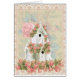 O fundo é teste padrão cor-de-rosa da antiguidade bege. A imagem central é de um birdhouse branco do Victorian coberto dentro e sentando-se em uma cama de rosas cor-de-rosa. A beira do cartão é design do rosa do rosa do laço do marfim. Dentro do vazio.