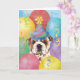 Feliz aniversário com este design bonitinho com um sorridente cachorro Bulldog vestindo chapéu de festa cercado por balões coloridos, confetti e Streers.