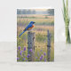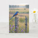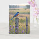 Um belo pássaro azul tocado num posto rústico de cerca em flores silvestres roxas para o aniversário. O texto pode ser alterado.
