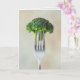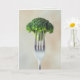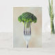 A vibrant piece of fresh broccoli pierced on the prongs of a fork, set against a softly blurred background.