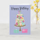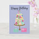 This is a birthday card with a double layered birthday cake decorated with flowers, leaves and candles. There are two wrapped presents with ribbons and bows.
