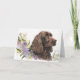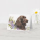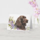 Design de aquarela de um lindo cão de panela de chocolate em um jardim de flores de primavera para o aniversário de qualquer um.