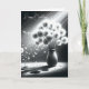 Buquê de dandelion branco fluffy num vaso com mudas flutuantes e raios solares sobre fundo preto. O texto pode ser alterado.