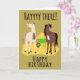 This is a funny birthday card with two illustrated horses, one cream and one brown. The text is a pun saying, ‘Hayyyyy there! Happy Birthday’ with the horses standing in hay and a green wheelbarrow, filled with hay next to them.