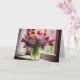 Tulipas e lilases buquês na janela da fazenda. O texto é editável.