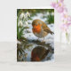 A robin gazes at its reflection in a small puddle, amidst a peaceful scene of delicate snowdrops and soft, white snow.