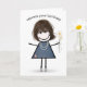 Bonita figura de palito com cabelo, tênis, vestido azul de denim, colar de pérolas e buquê de margarida. A cor branca do fundo pode ser alterada. Todo texto pode ser editado.