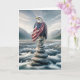 Uma águia-careca encharcada numa bandeira americana é empoleirada no topo de um cairn de pedra no meio de um rio fluido rodeado por montanhas durante um aniversário. O texto pode ser alterado.
