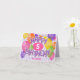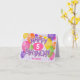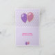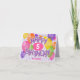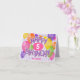 Este cartão de aniversário divertido e colorido para as raparigas apresenta a mensagem "Feliz Aniversário", soletrada em biscoitos roxos, realísticos, na frente do cartão, rodeados por balões multicolores e bandeiras de bunting - mensagem de dentro e idade e nome da criança podem ser personalizados - dois biscoitos de recorte em forma de balão adornam o dentro do cartão - o fundo é um pequeno bolinhas foscos em um fundo roxo claro - por katz_d_zynes