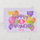 Este cartão de aniversário divertido e colorido para uma rapariga é descarregável e apresenta a mensagem "Feliz Aniversário" soletrada em biscoitos roxos de fosco realistas, arranjados com capricho na frente do cartão rodeados por balões multicolores - a mensagem no verso e a idade e o nome da criança podem ser personalizados - dois biscoitos de recorte em forma de balão destacam a parte posterior do cartão - o fundo é um pequeno padrão branco bolinhas em púrpura pálido - por katz_d_zynes