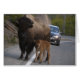 Adulto Bison com o tráfico de vitelos bloqueados no Parque Nacional de Yellowstone