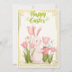 A cheerful white bunny waters pink tulips with a pastel watering can, surrounded by spring blooms and golden accents. This card celebrates Easter with a touch of garden magic, perfect for sending joy and renewal.