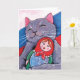 Todas as vezes cumprimentando o cartão para amantes de gatos. Um gato russo azul de olhos amarelos mostra suas raízes russas segurando uma boneca de babushka/matryoshka e sentando-se em frente à bandeira russa. Dentro esquerdo do vazio. Criada de uma pintura original © Lisa Marie Robinson. Todos os Direitos Reservados.