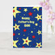 Feliz cartão de Dia de os pais para filho com estrelas azuis, vermelhas e amarelas e verso pensativo.