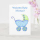 Diga parabéns e dê boas-vindas a um bebê novo com este cartão personalizado de nome bonito. Este cartão de saudação de tendências apresenta uma escuta azul para bebês com as palavras personalizáveis "Welcome Baby" e o nome na frente. Uma fileira de flores azuis está no lado dentro à esquerda do cartão, com o lado direito tendo palavras de sentimento personalizáveis que também são personalizadas com o nome do bebê. O botão azul é acentuado com as cores do verde limão. Esta placa de parabéns coordena-se com outros produtos para bebês nesta loja para presentes de chá excelente e outros produtos. O buggy é uma arte original na moda, fofa e chorosa da Phyllis Dobbs. Totalmente personalizável.