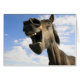 Um grande cavalo marrom está bocejando e mostrando seus dentes sujos.