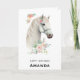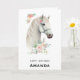 Cartão de aniversário com uma ilustração mágica de uma bela cabeça de cavalo branca. Cercado por pequenas flores cor-de-rosa giras. Boho elegante para amantes de cavalos.