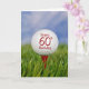 Feche uma bola de golfe branca numa colmeia vermelha na grama com fundo do céu para o 60º aniversário.
