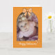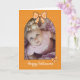 Um design alegre do cartão com fotos do Halloween que apresenta uma imagem arquivada, aparada com um arco de gingham branco e laranja no topo e um arco correspondente menor no canto. O fundo da bolinhas adiciona charme brincalhão, fazer perfeito para enviar uma doce saudação de Halloween aos entes queridos. Ideal para compartilhar uma foto festiva de outono com avós, parentes ou amigos — antes da grande noite chegar!