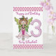 Se você quiser que esta design para uma idade diferente ou em cores diferentes, por favor entre em contato conosco através da nossa loja Celebration Bazaar e ficaremos felizes em ajudar. Um design de aniversário ultra fofo para a jovem que está envelhecendo três anos, apresentando uma ilustração de uma princesa fada vestida de rosa com rosas no cabelo. A princesa fada está ao lado de um grande número três com bolinhas cor-de-rosa. Bolinhas cor-de-rosa nas bordas cor-de-rosa na parte superior e inferior do design. O texto na frente pode ser personalizado para adicionar o nome de sua própria princesa especial de fada.
