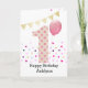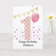 Um cartão cor-de-rosa de menina primeiro aniversario, que você pode personalizar com o nome dela. A frente desta placa de primeiro aniversario de tendência para ela apresenta o número um em uma bolinhas cor-de-rosa com um balão rosa pronto para flutuar. O plano de fundo tem um confetti colorido e um banner de bunda de ouro suave no topo.A mensagem de dentro pode ser facilmente personalizada se você quiser. Um cartão de primeiro aniversario bonito para ela.