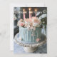 Cartão Bolo de Aniversário Azul e Branco Flores Rosa Vela