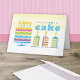 Um bolo de aniversário alto com um forte gelo pastel coberto com velas verdes acesas ao lado do texto que diz "hoje haverá bolo". Três fatias de bolo de 4 camadas sentam-se debaixo do texto e uma bolinhas amarela e branca fornece o pano de fundo para estas sobremesas de aniversário tradicionais. ©Mindy Pierce