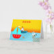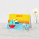 Bon Voyage, Good Trip, cartão de saudação em papel escrito em chinês. Um pôr do sol com um veleiro, rebocador, peixe, ondas e pelicanos no píer. Mande-os para o pôr do sol com este cartão brilhante e divertido. dentro de vazio para a sua mensagem pessoal. Arte, imagem e direitos de autor © Shoaff Ballanger Studios.