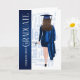 Felicite a formando feminina com este boné azul real e ganhe a saudação do tema, apresentando uma mulher clara com cabelo marrom médio longo.